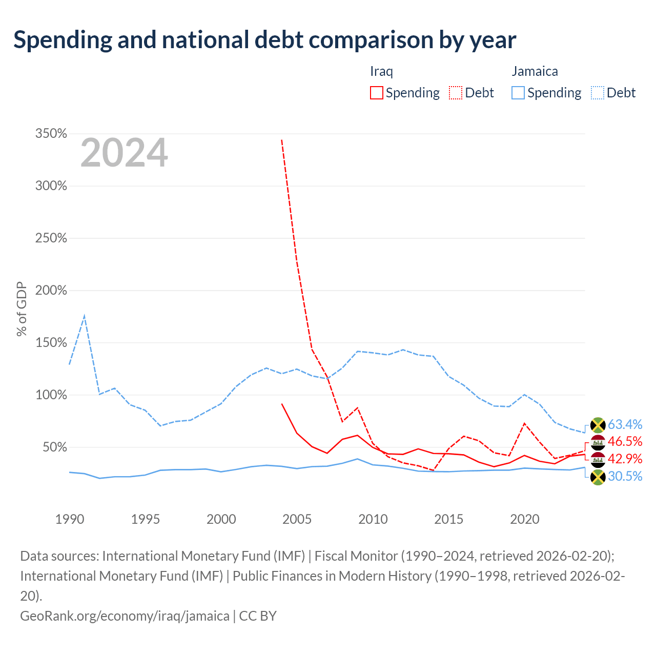 Iraq has $130B in government debt (46.5% of GDP), compared to $14B (63.4% of GDP) in Jamaica.
