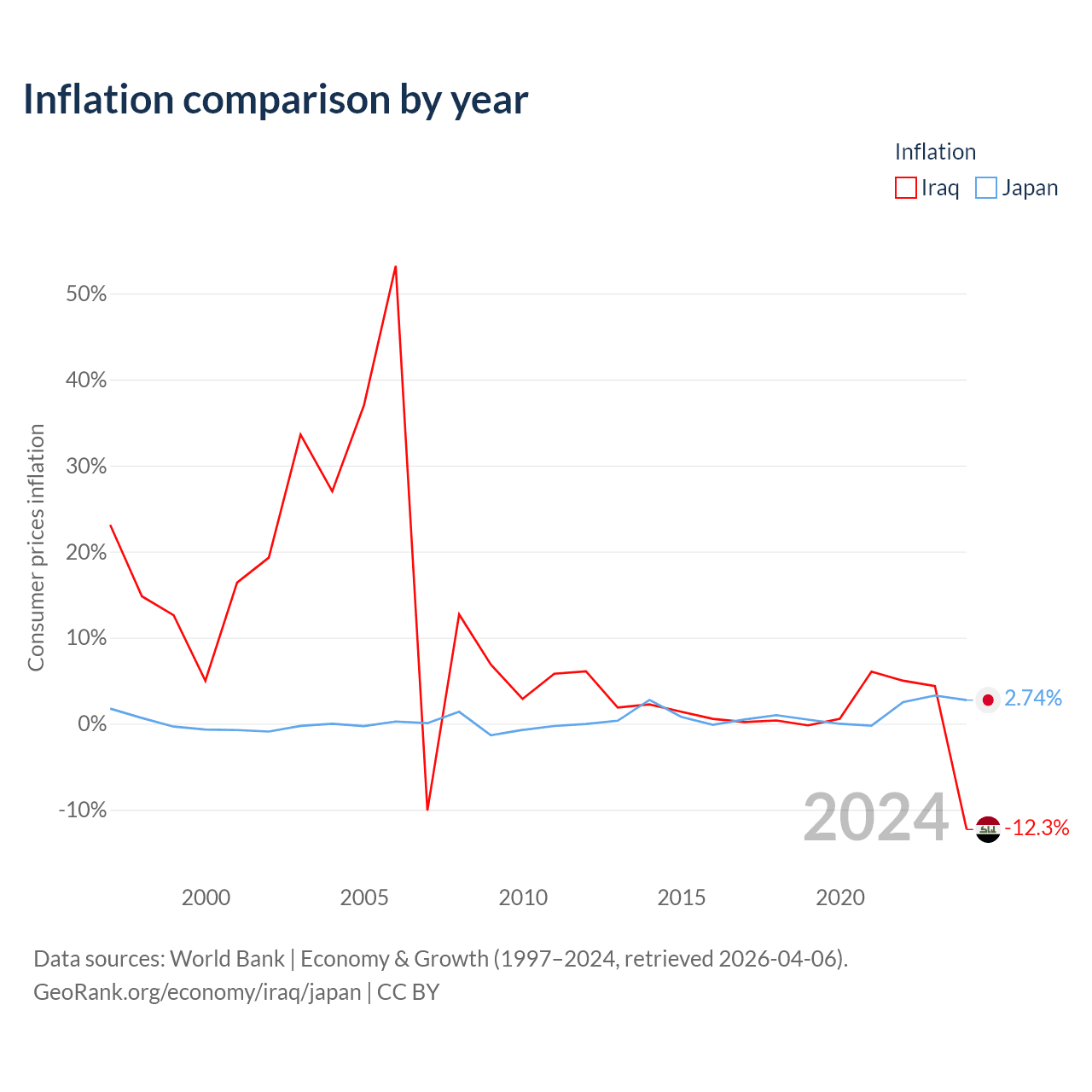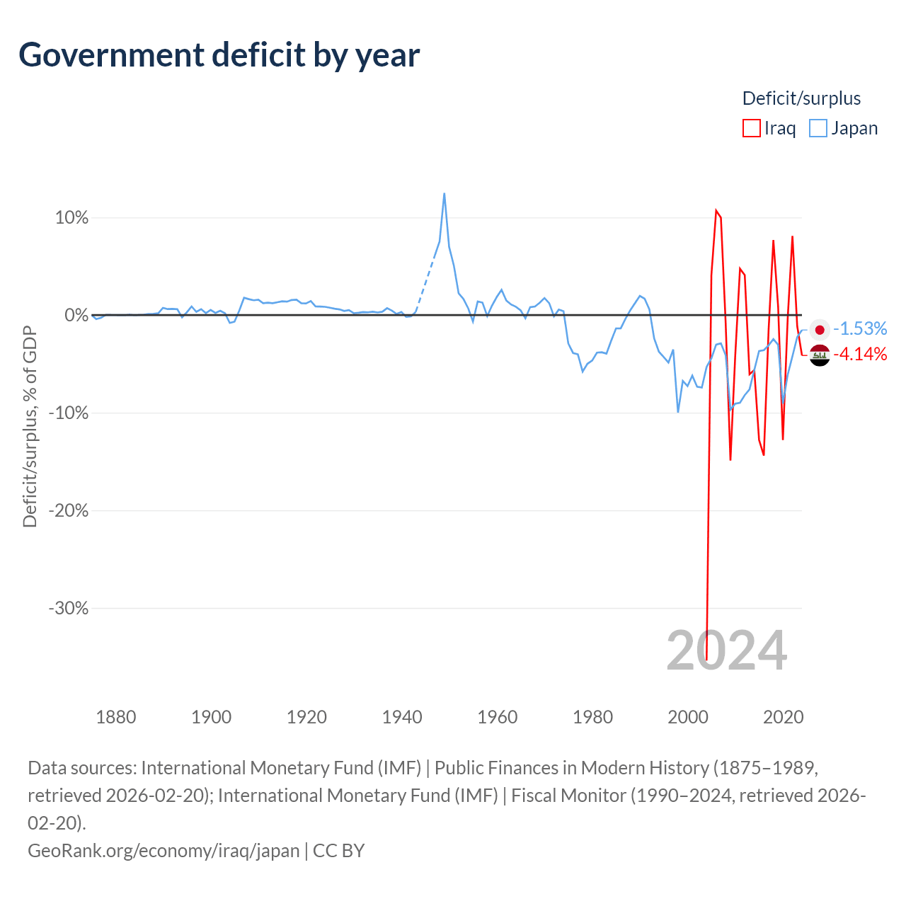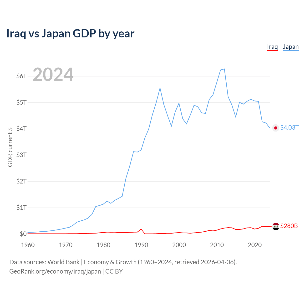 Iraq has a GDP of $280B compared to $4.03T for Japan, ranking 50/197 and 4/197 by economy size, respectively.