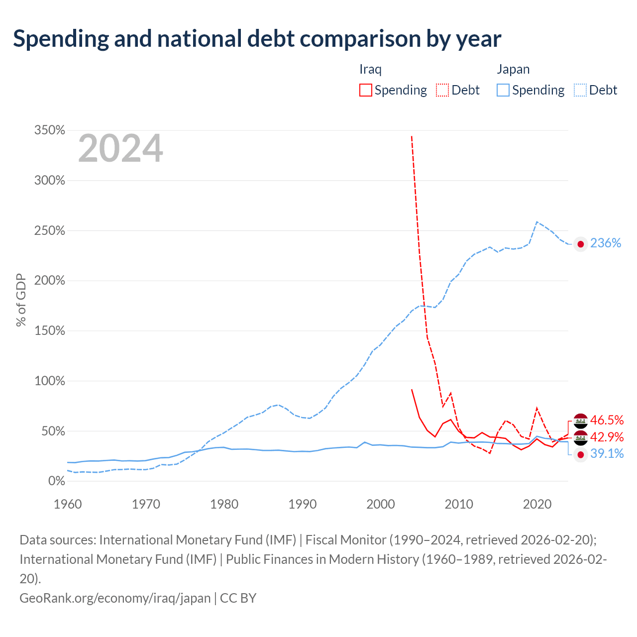 Iraq has $130B in government debt (46.5% of GDP), compared to $9.51T (236.1% of GDP) in Japan.
