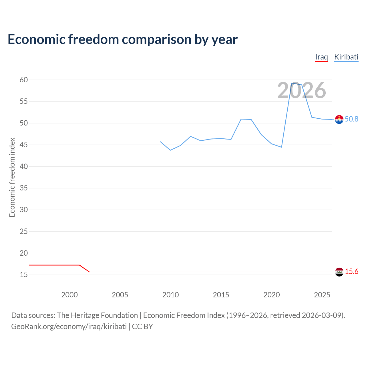The Economic Freedom Index for Iraq is 15.6, ranking 196/197, compared to 50.8 for Kiribati, ranking 158/197. The chart above displays a comparison of annual changes in economic freedom indexes.