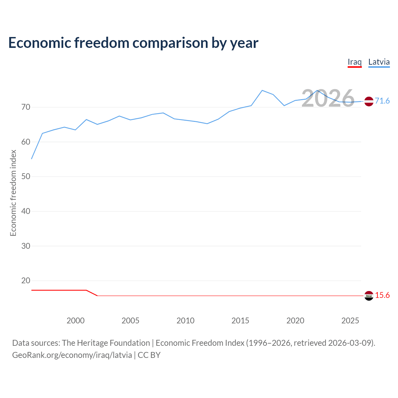 The Economic Freedom Index for Iraq is 15.6, ranking 196/197, compared to 71.6 for Latvia, ranking 31/197. The chart above displays a comparison of annual changes in economic freedom indexes.