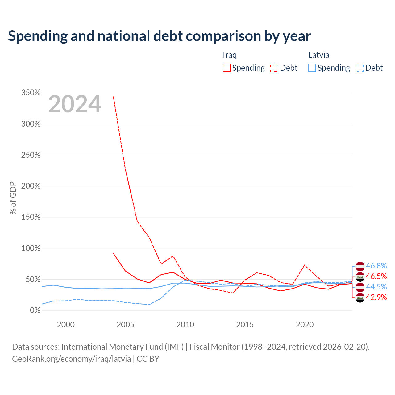 Iraq has $130B in government debt (46.5% of GDP), compared to $20.4B (46.8% of GDP) in Latvia.