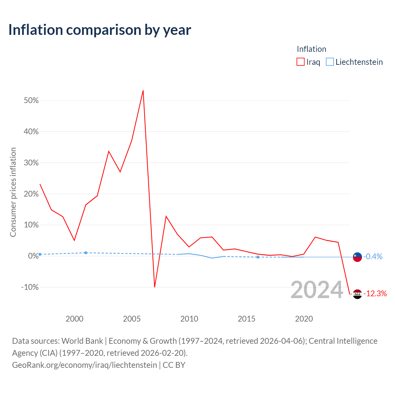 Over the past 24 years, Iraq has recorded an average annual inflation rate of 11.4%, compared with 0.04% in Liechtenstein. In 2020, inflation was -12.3% in Iraq and -0.4% in Liechtenstein.