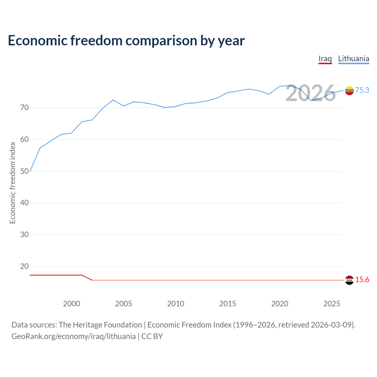 The Economic Freedom Index for Iraq is 15.6, ranking 196/197, compared to 75.3 for Lithuania, ranking 18/197. The chart above displays a comparison of annual changes in economic freedom indexes.