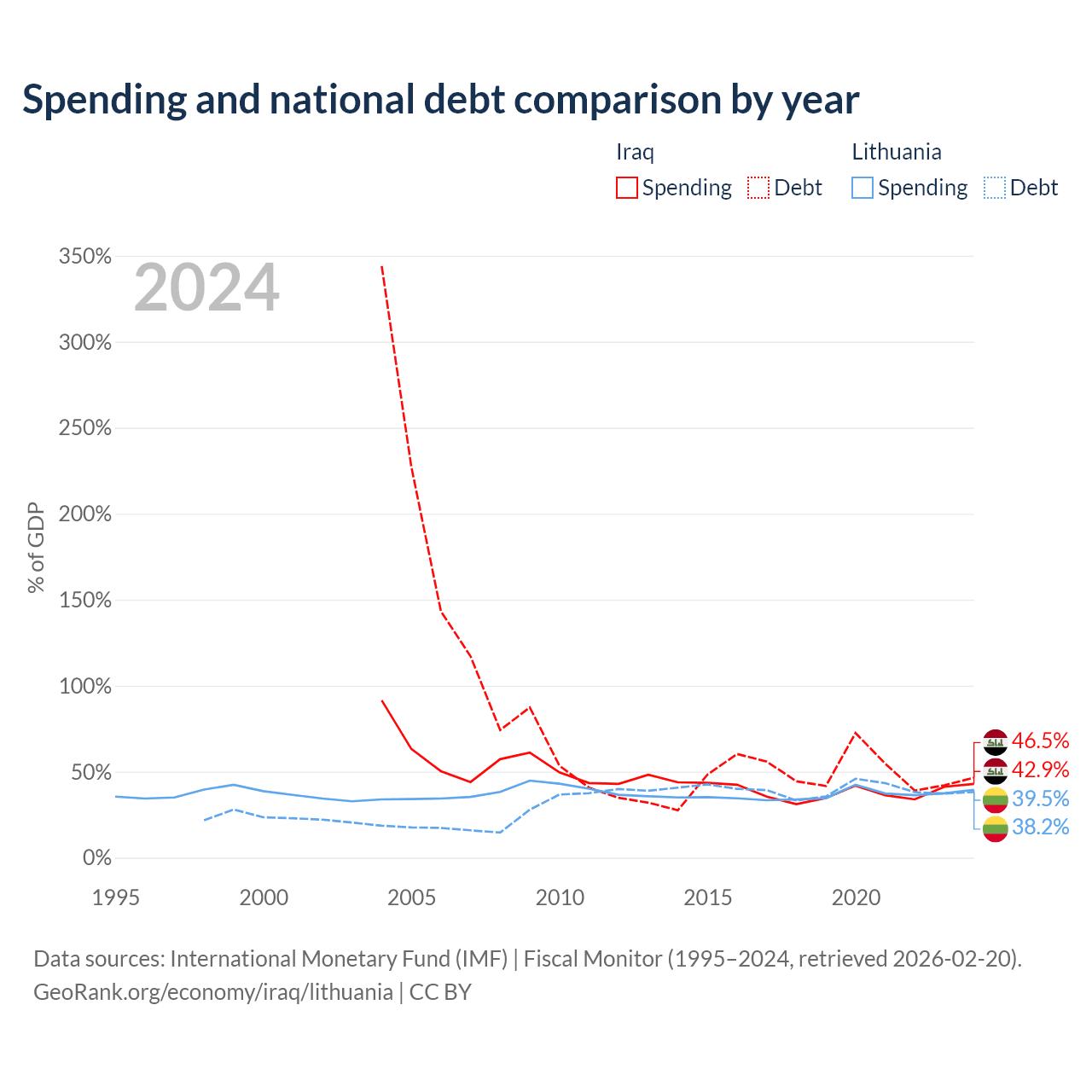Iraq has $130B in government debt (46.5% of GDP), compared to $32.4B (38.2% of GDP) in Lithuania.