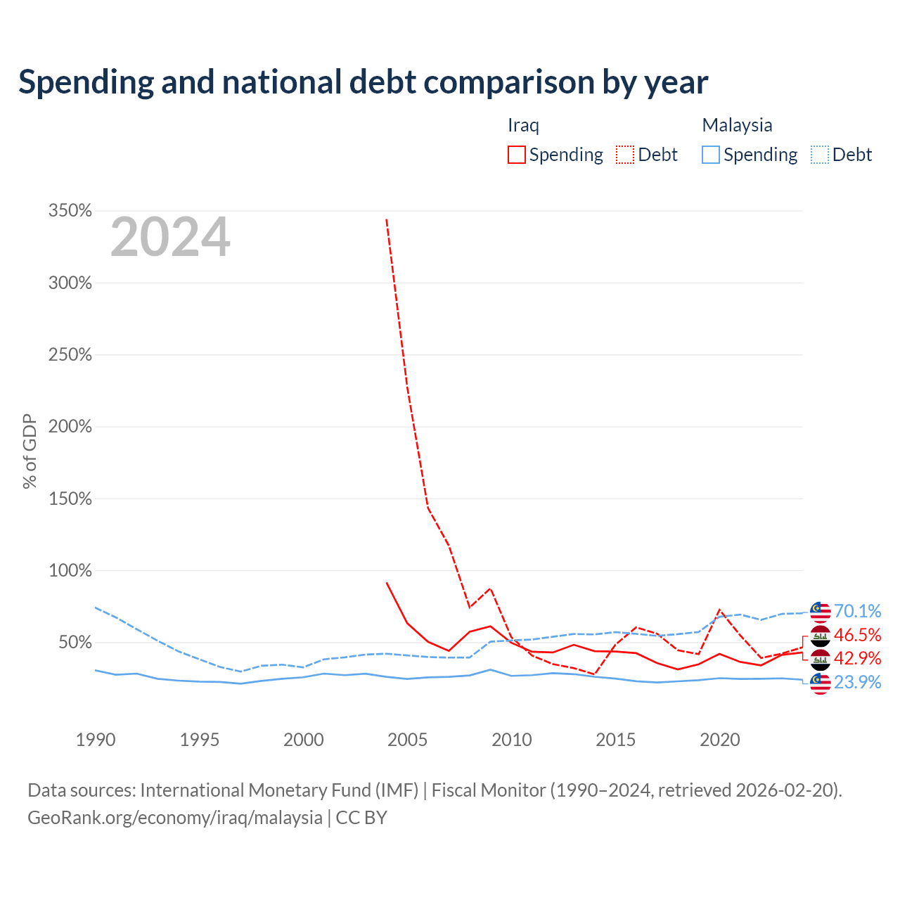 Iraq has $130B in government debt (46.5% of GDP), compared to $296B (70.1% of GDP) in Malaysia.