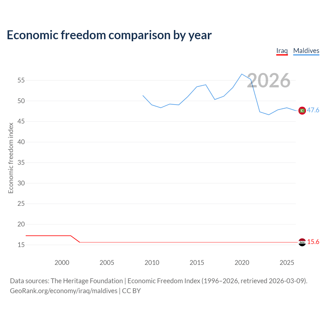 The Economic Freedom Index for Iraq is 15.6, ranking 196/197, compared to 47.6 for Maldives, ranking 174/197. The chart above displays a comparison of annual changes in economic freedom indexes.