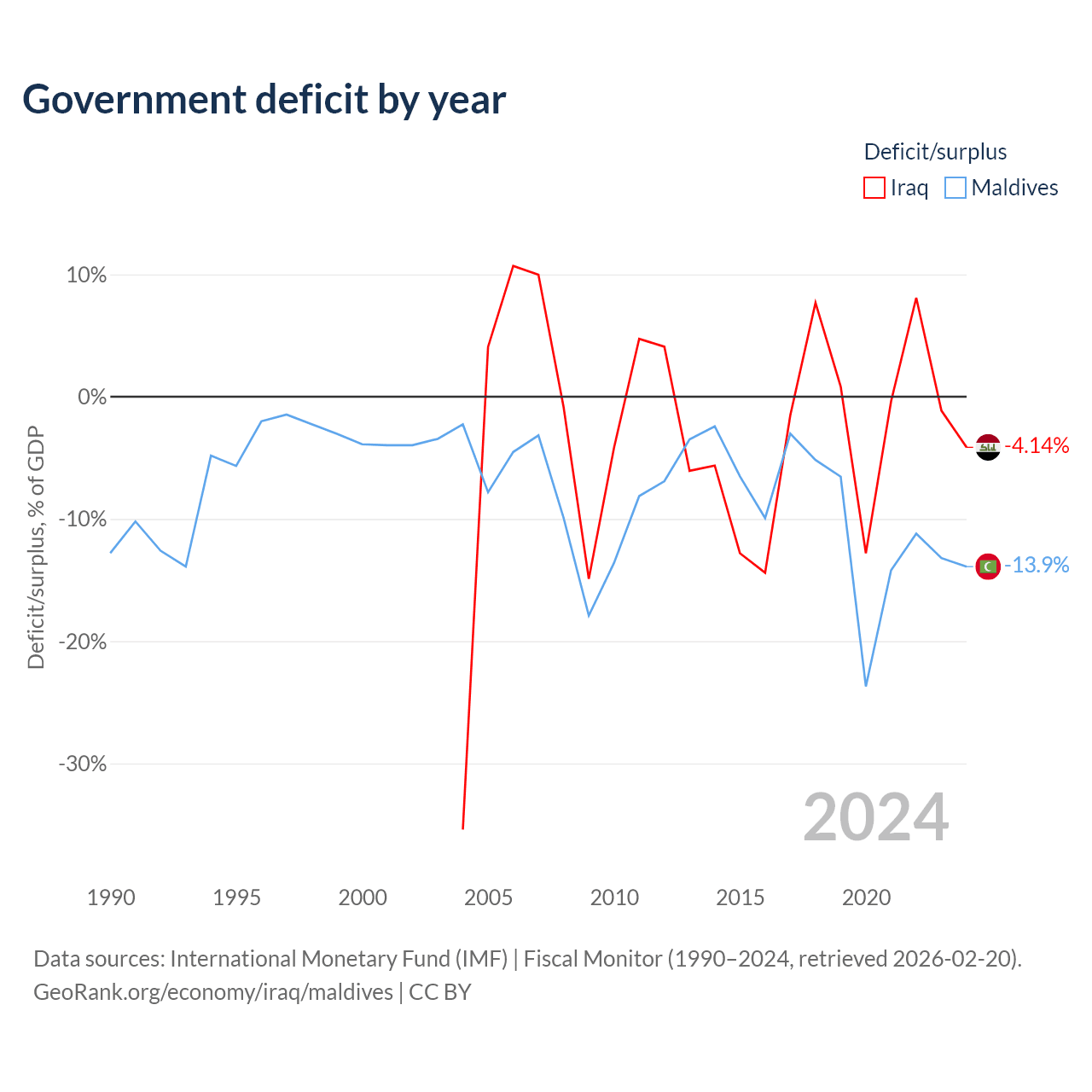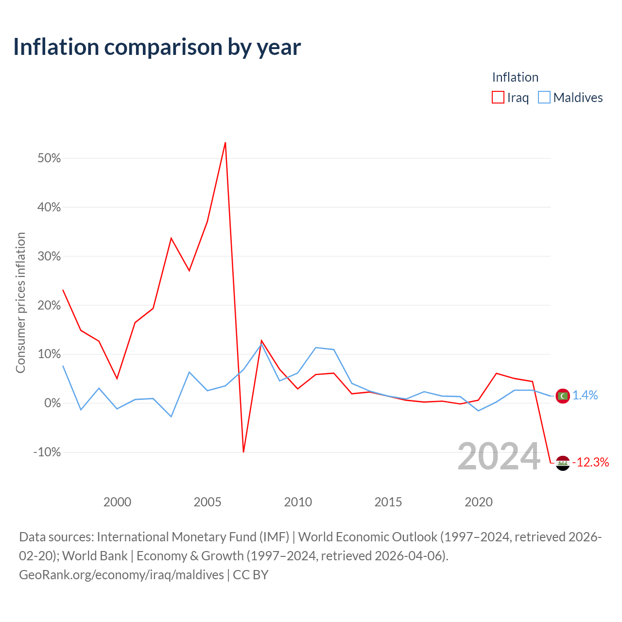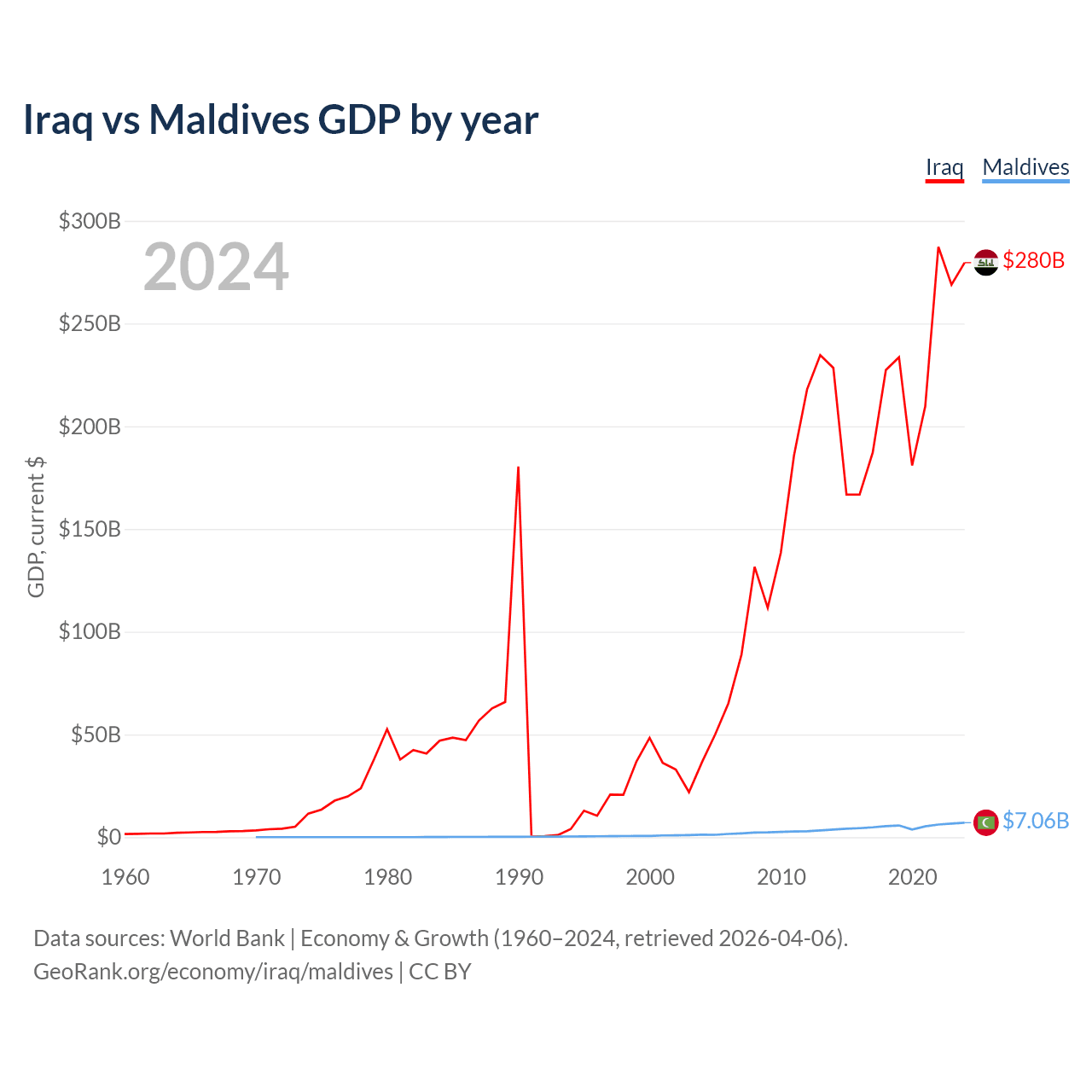 Iraq has a GDP of $280B compared to $7.06B for Maldives, ranking 50/197 and 159/197 by economy size, respectively.