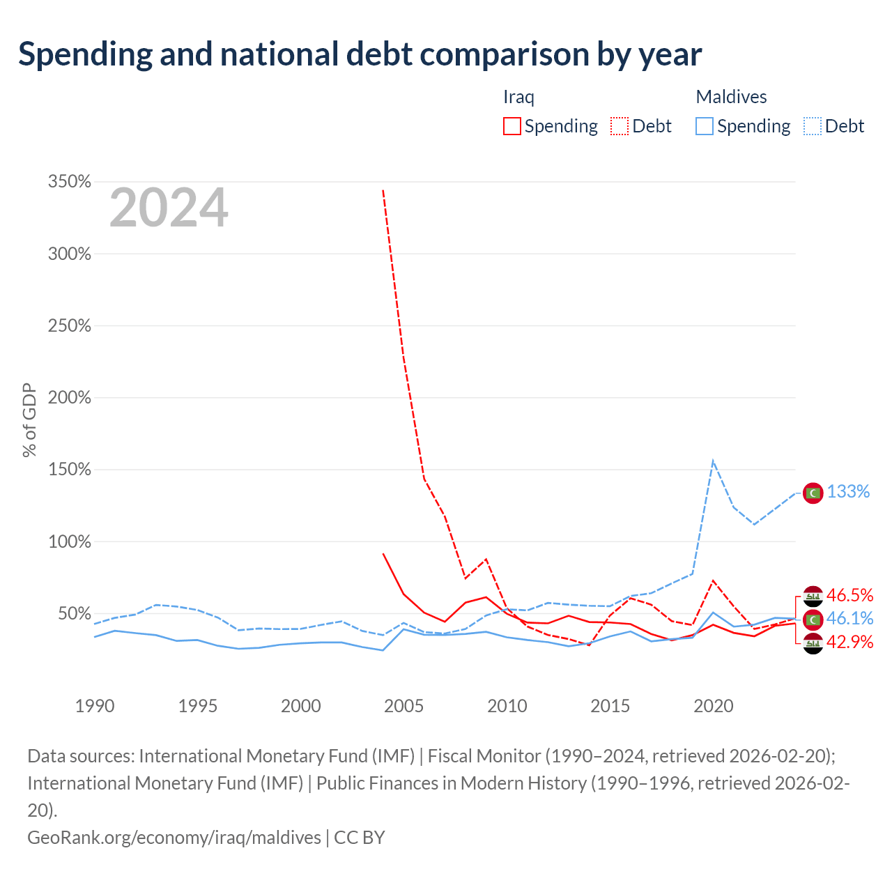 Iraq has $130B in government debt (46.5% of GDP), compared to $9.41B (133.3% of GDP) in Maldives.