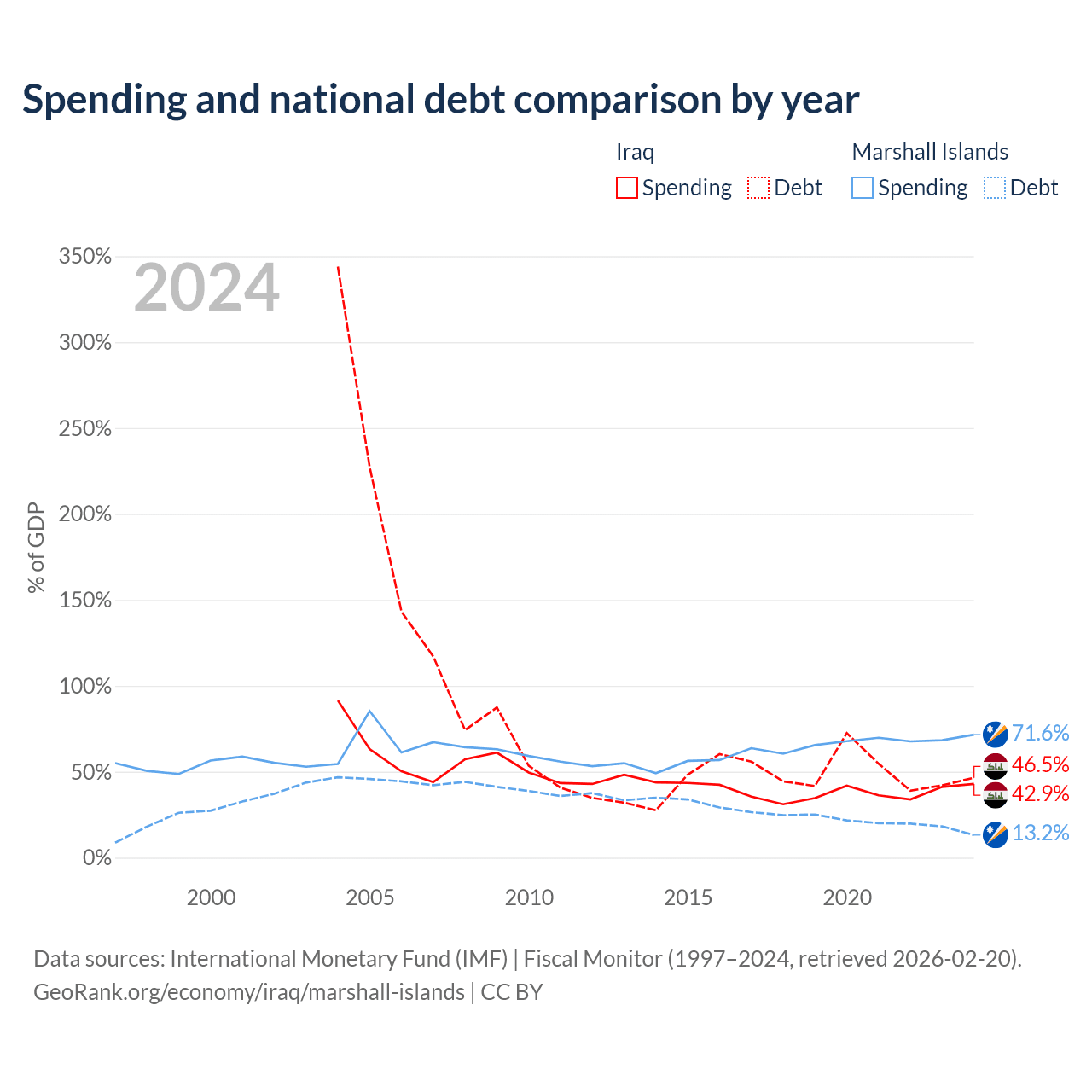 Iraq has $130B in government debt (46.5% of GDP), compared to $38.4M (13.2% of GDP) in the Marshall Islands.