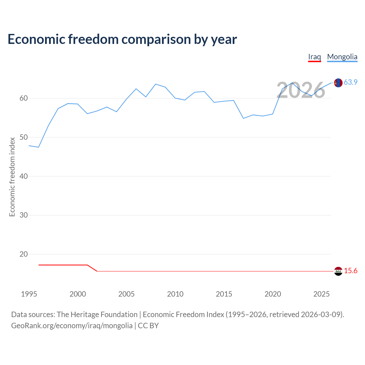The Economic Freedom Index for Iraq is 15.6, ranking 196/197, compared to 63.9 for Mongolia, ranking 76/197. The chart above displays a comparison of annual changes in economic freedom indexes.