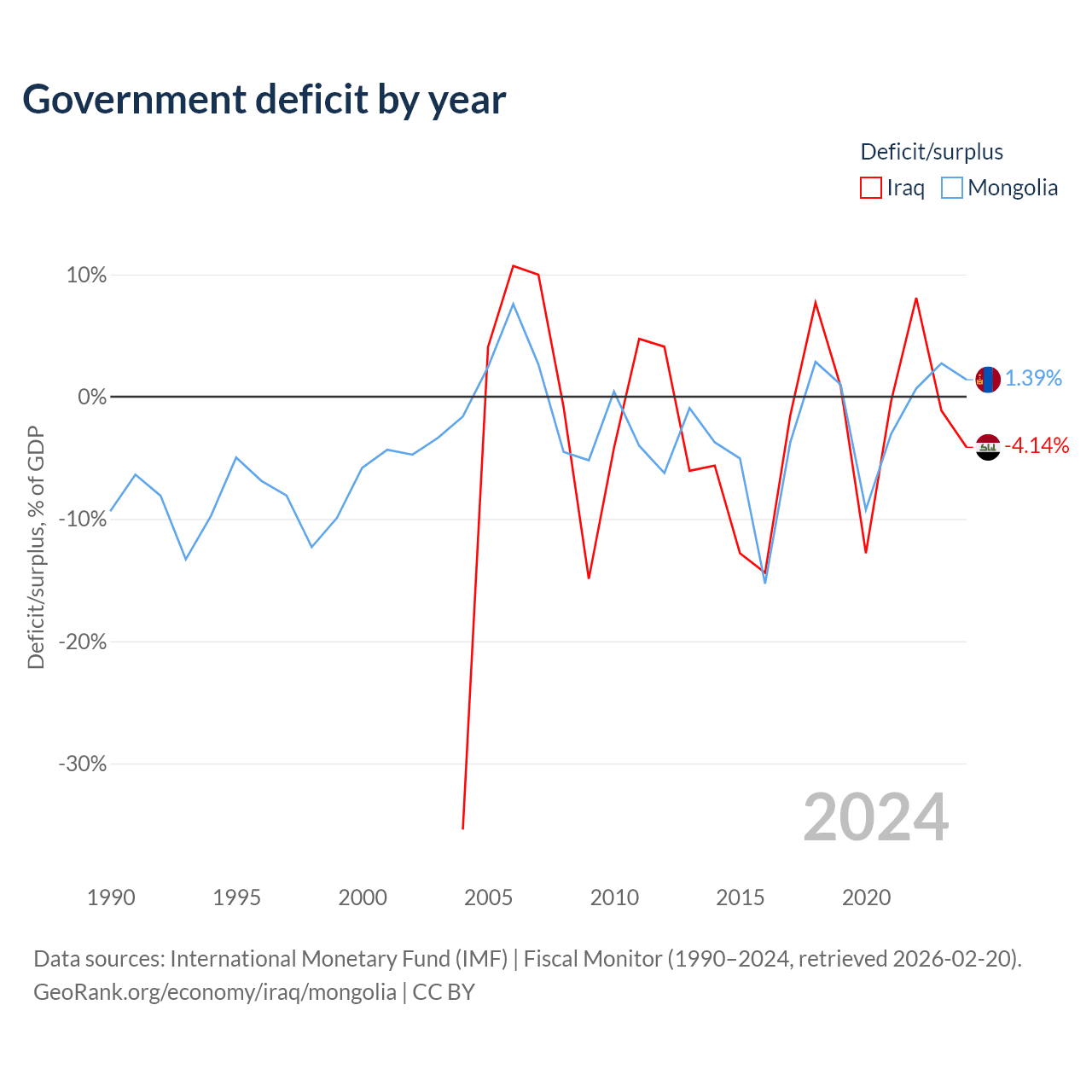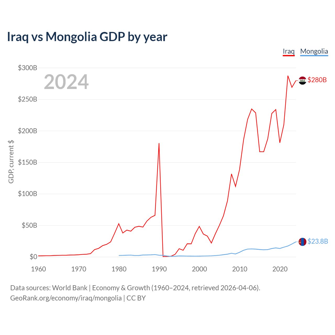 Iraq has a GDP of $280B compared to $23.8B for Mongolia, ranking 50/197 and 121/197 by economy size, respectively.
