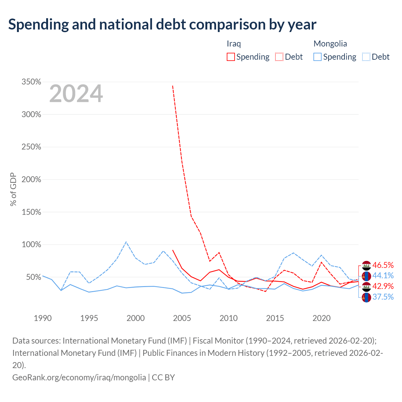 Iraq has $130B in government debt (46.5% of GDP), compared to $10.5B (44.1% of GDP) in Mongolia.