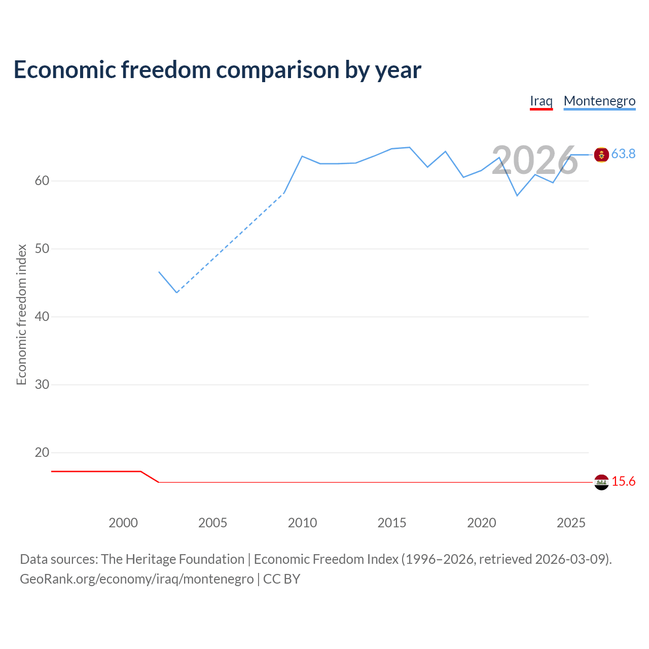 The Economic Freedom Index for Iraq is 15.6, ranking 196/197, compared to 63.8 for Montenegro, ranking 78/197. The chart above displays a comparison of annual changes in economic freedom indexes.