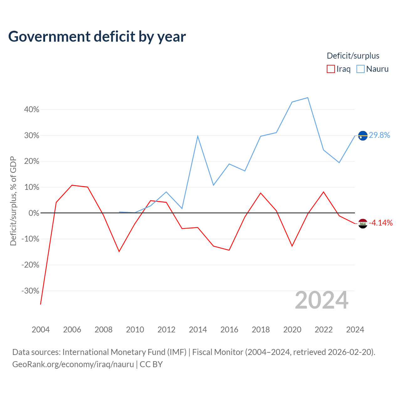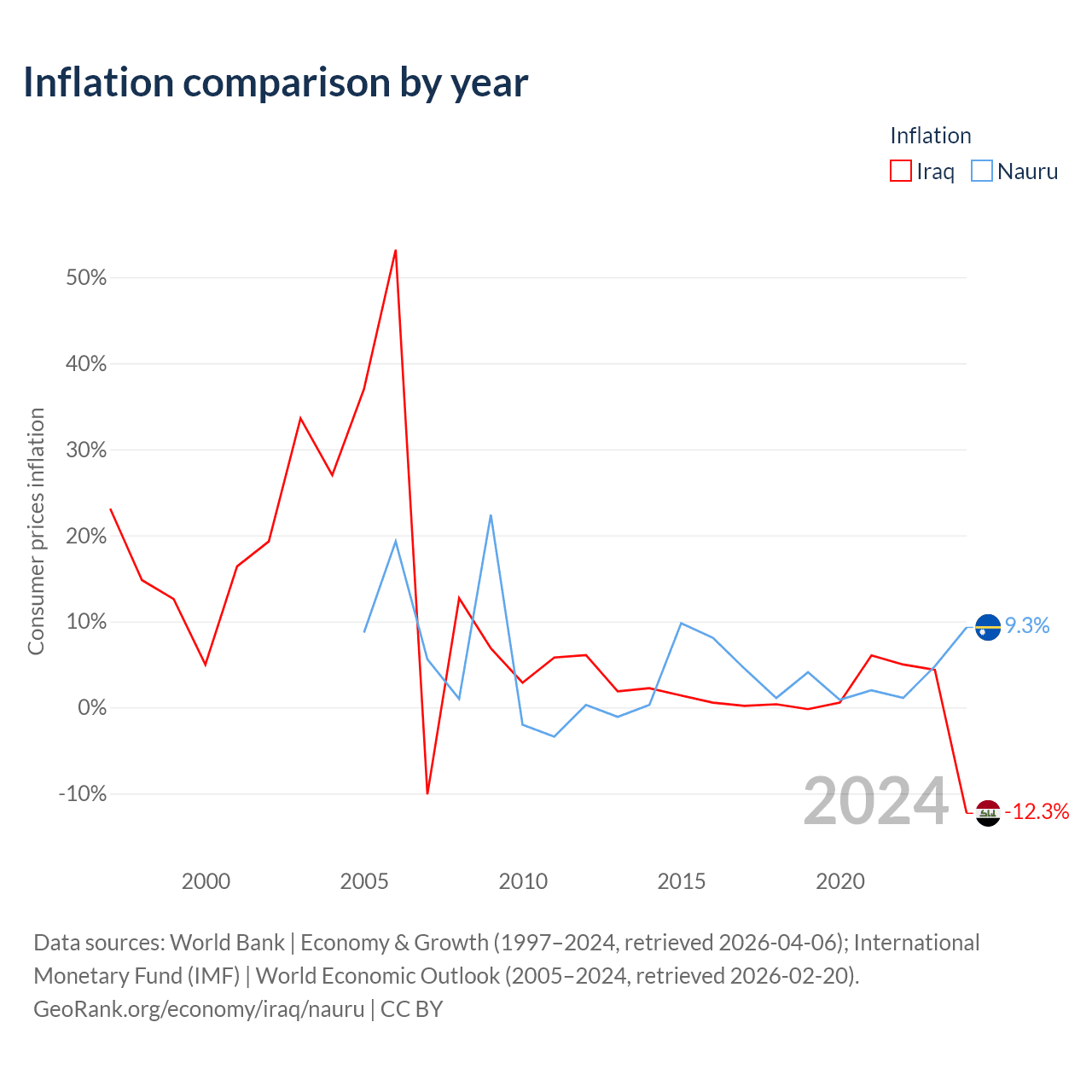Over the past 20 years, Iraq has recorded an average annual inflation rate of 6.23%, compared with 4.84% in Nauru. In 2024, inflation was -12.3% in Iraq and 9.3% in Nauru.