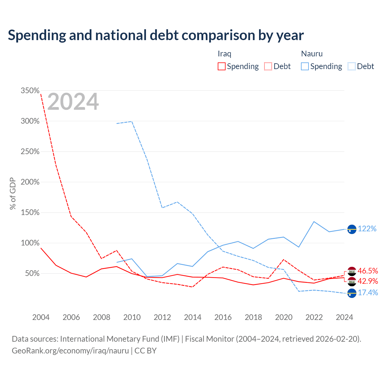 Iraq has $130B in government debt (46.5% of GDP), compared to $28.3M (17.4% of GDP) in Nauru.