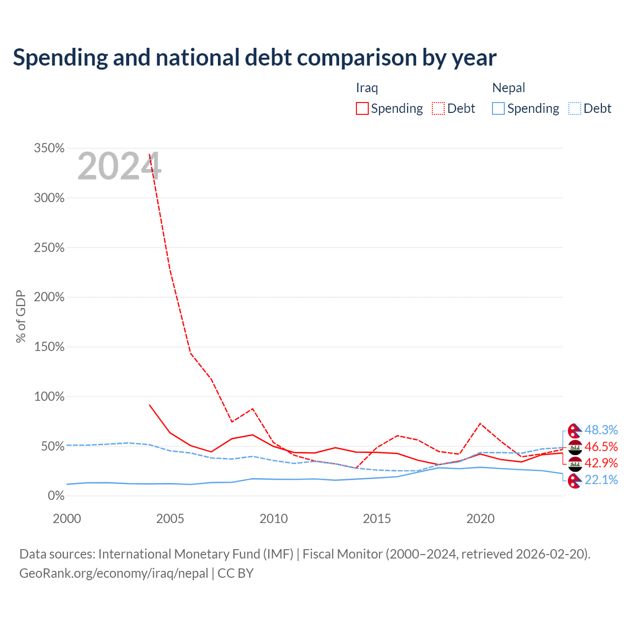 Iraq has $130B in government debt (46.5% of GDP), compared to $20.7B (48.3% of GDP) in Nepal.