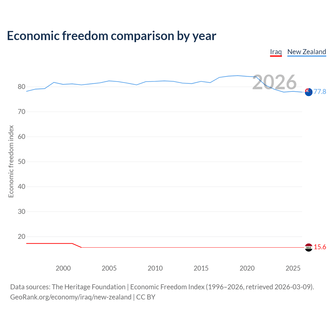 The Economic Freedom Index for Iraq is 15.6, ranking 196/197, compared to 77.8 for New Zealand, ranking 13/197. The chart above displays a comparison of annual changes in economic freedom indexes.