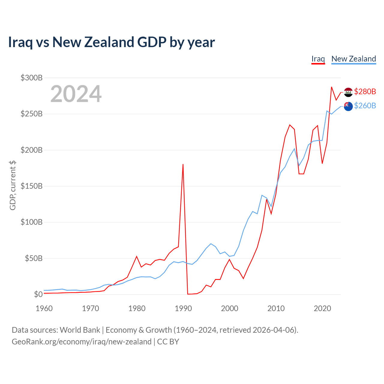 Iraq has a GDP of $280B compared to $260B for New Zealand, ranking 50/197 and 52/197 by economy size, respectively.