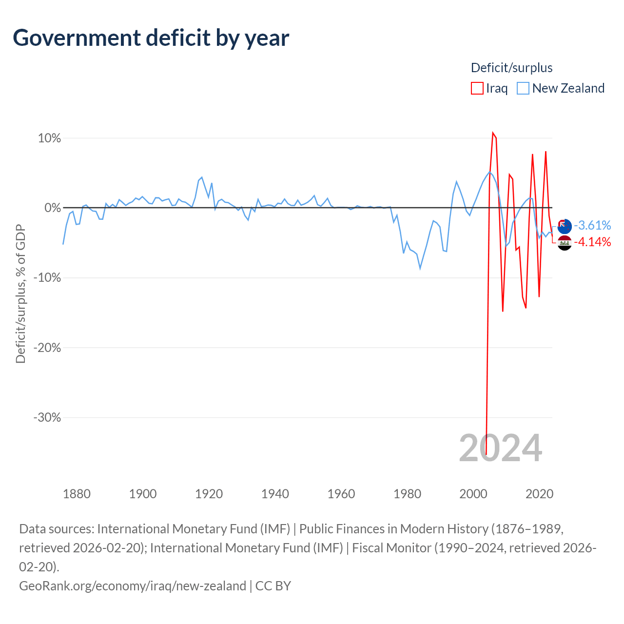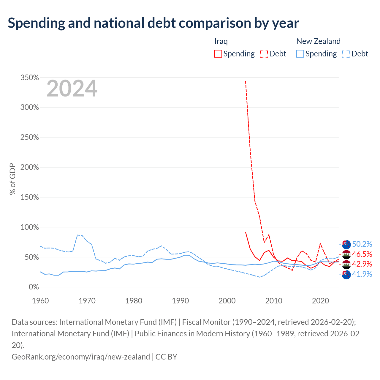 Iraq has $130B in government debt (46.5% of GDP), compared to $131B (50.2% of GDP) in New Zealand.