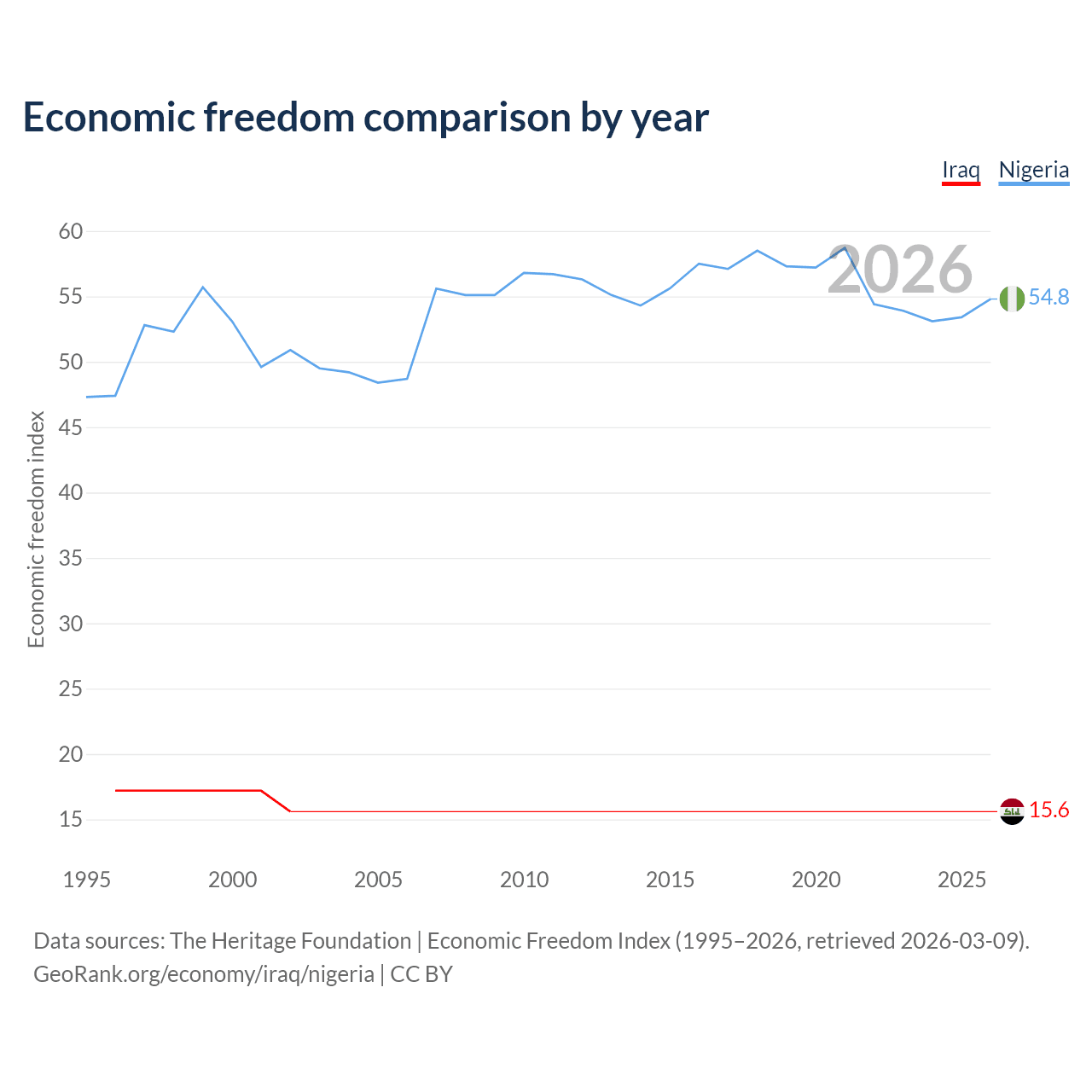 The Economic Freedom Index for Iraq is 15.6, ranking 196/197, compared to 54.8 for Nigeria, ranking 132/197. The chart above displays a comparison of annual changes in economic freedom indexes.