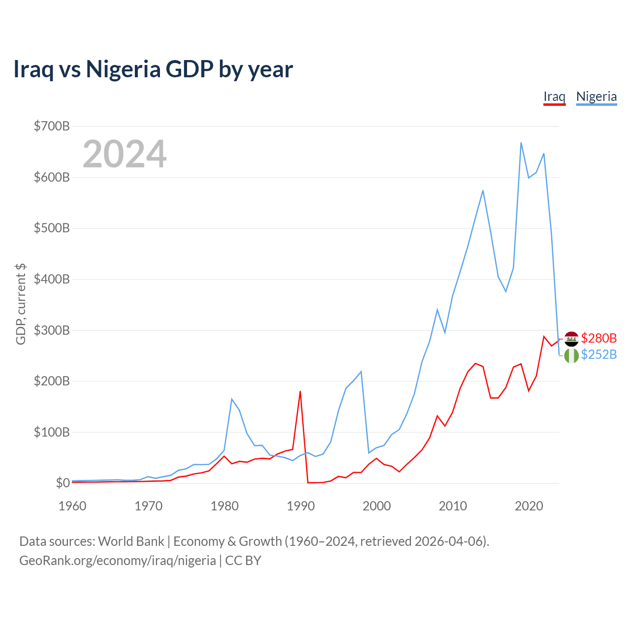 Iraq has a GDP of $280B compared to $252B for Nigeria, ranking 50/197 and 54/197 by economy size, respectively.