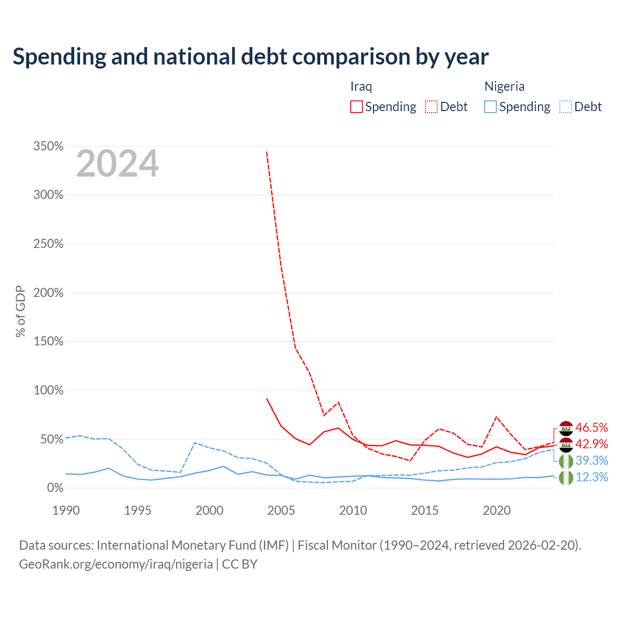 Iraq has $130B in government debt (46.5% of GDP), compared to $99.2B (39.3% of GDP) in Nigeria.