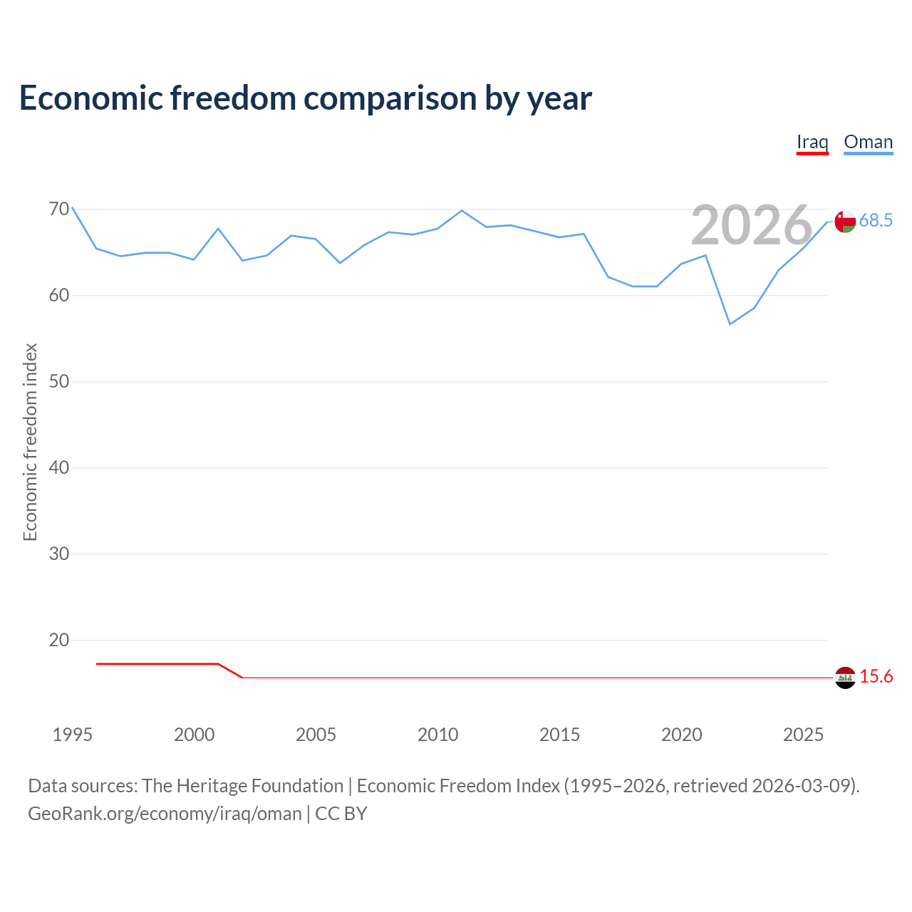 The Economic Freedom Index for Iraq is 15.6, ranking 196/197, compared to 68.5 for Oman, ranking 45/197. The chart above displays a comparison of annual changes in economic freedom indexes.