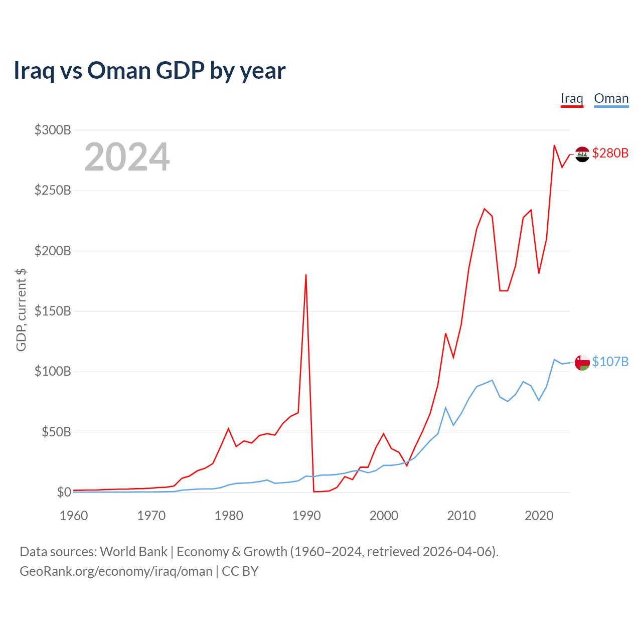 Iraq has a GDP of $280B compared to $107B for Oman, ranking 50/197 and 70/197 by economy size, respectively.