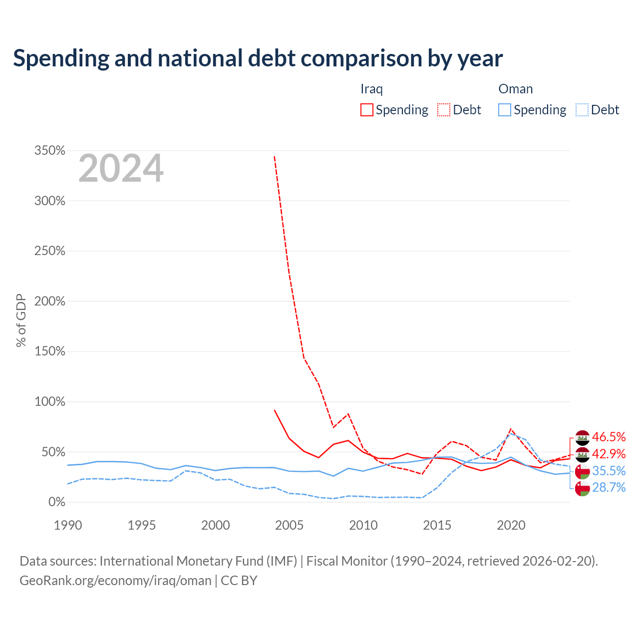 Iraq has $130B in government debt (46.5% of GDP), compared to $38B (35.5% of GDP) in Oman.