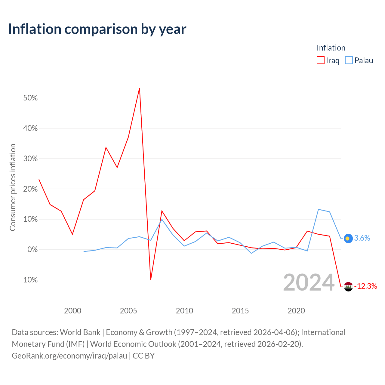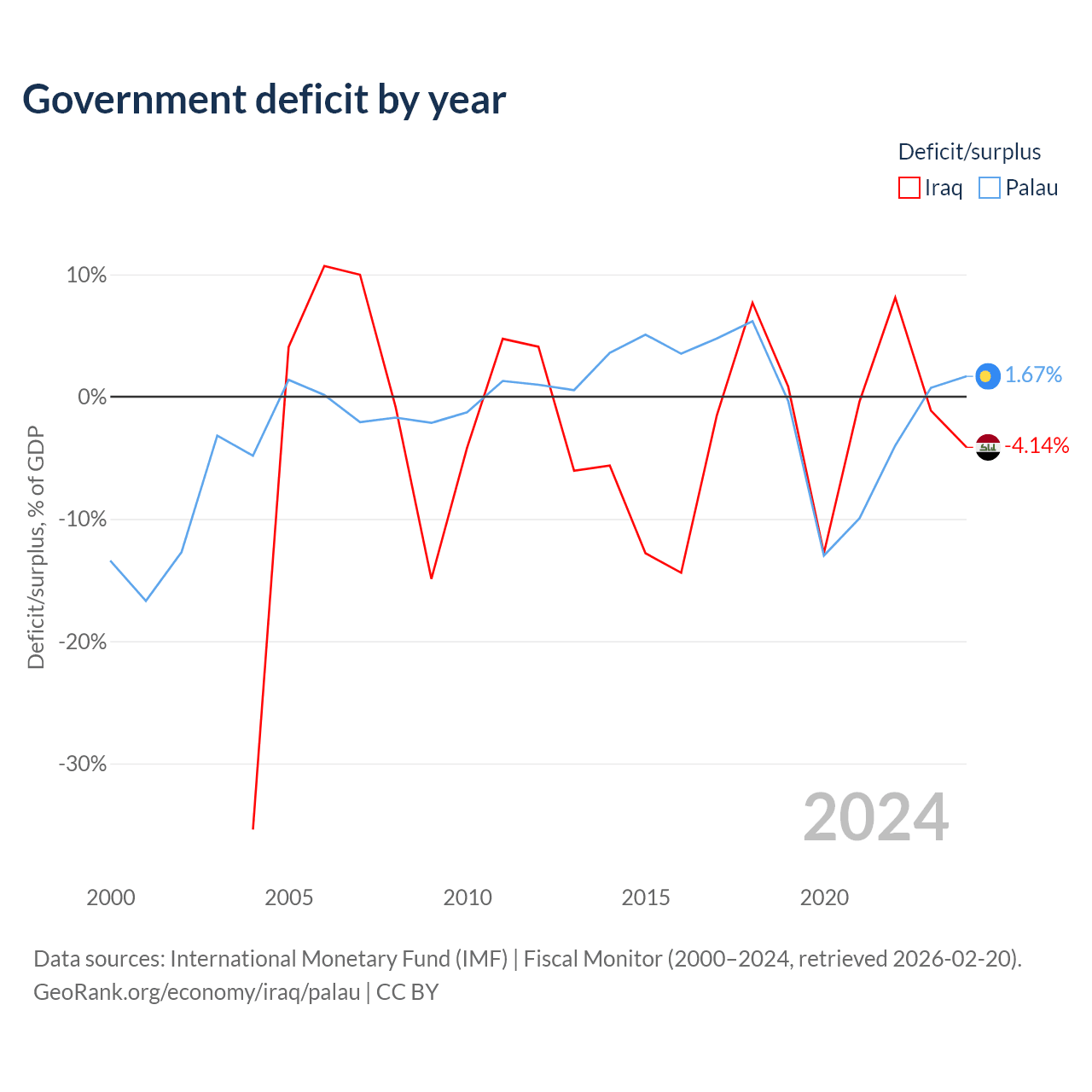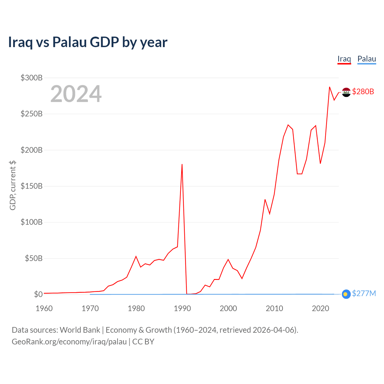 Iraq has a GDP of $280B compared to $277M for Palau, ranking 50/197 and 194/197 by economy size, respectively.