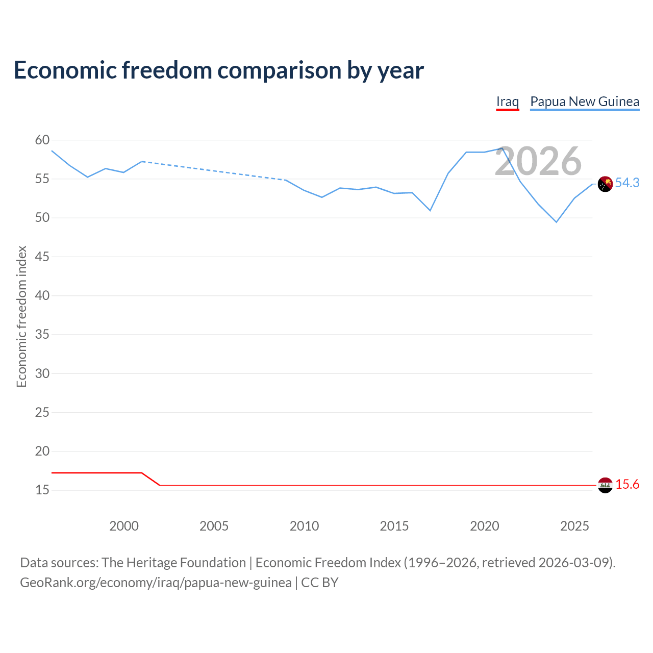 The Economic Freedom Index for Iraq is 15.6, ranking 196/197, compared to 54.3 for Papua New Guinea, ranking 134/197. The chart above displays a comparison of annual changes in economic freedom indexes.