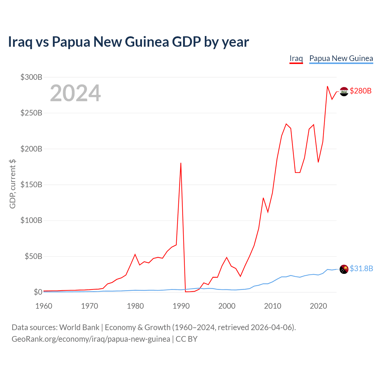 Iraq has a GDP of $280B compared to $31.8B for Papua New Guinea, ranking 50/197 and 110/197 by economy size, respectively.