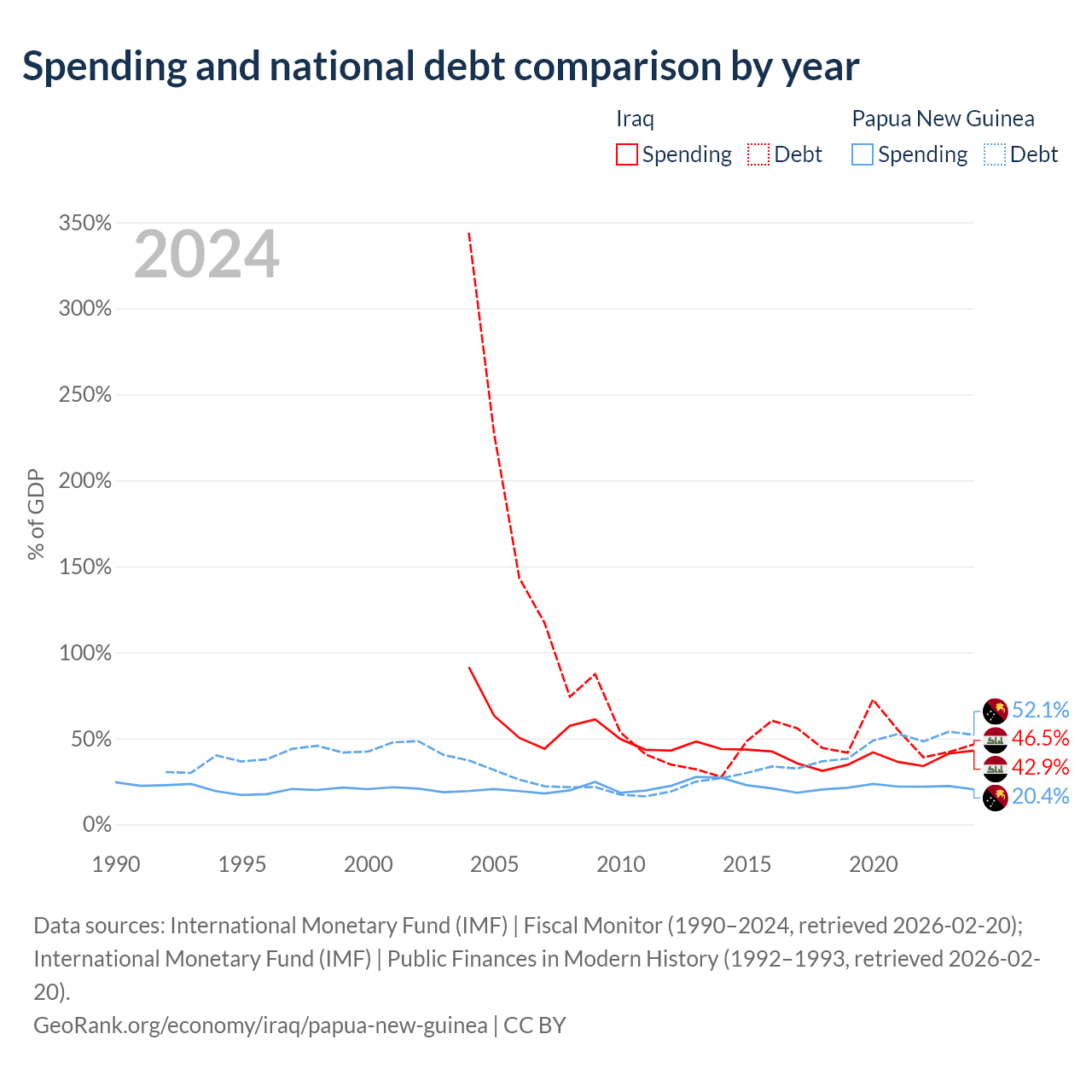 Iraq has $130B in government debt (46.5% of GDP), compared to $16.6B (52.1% of GDP) in Papua New Guinea.