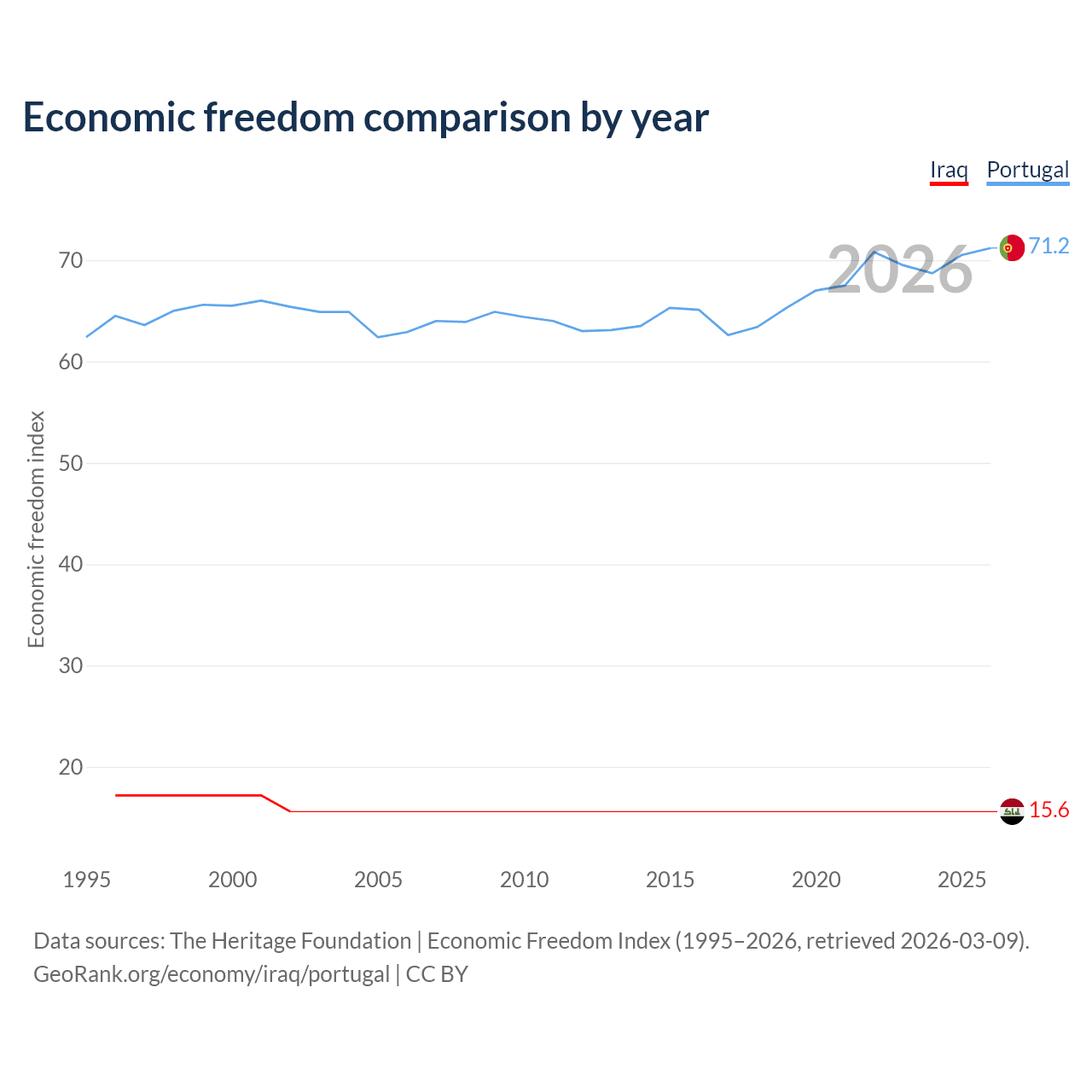 The Economic Freedom Index for Iraq is 15.6, ranking 196/197, compared to 71.2 for Portugal, ranking 33/197. The chart above displays a comparison of annual changes in economic freedom indexes.