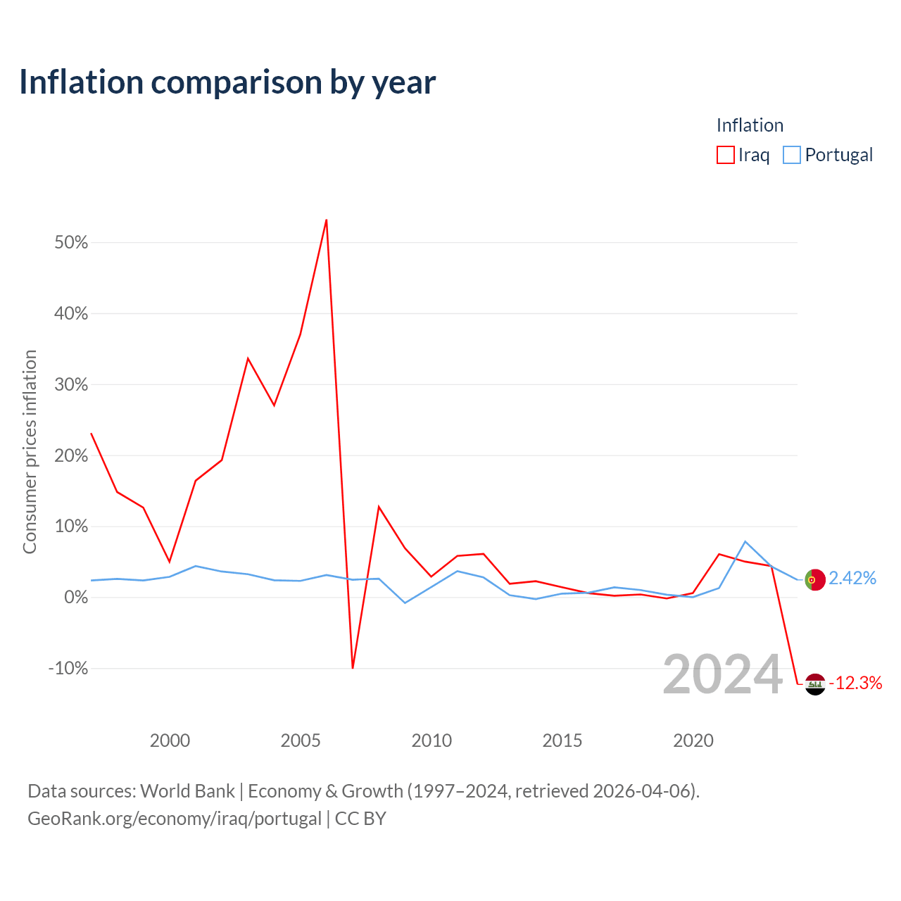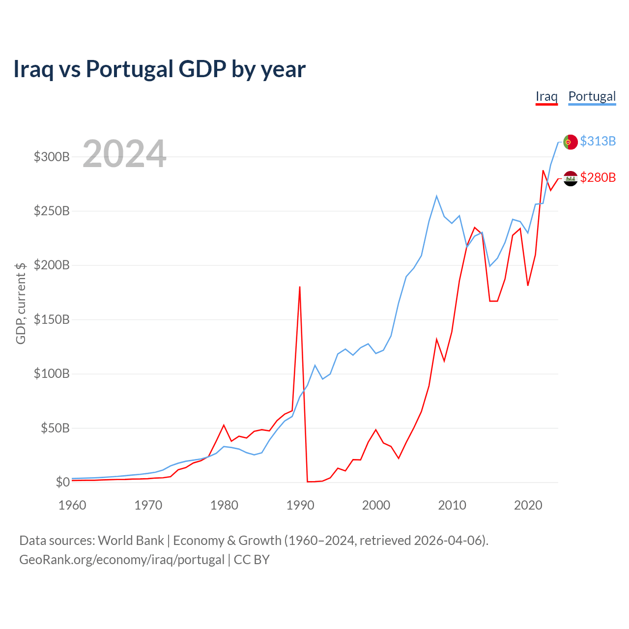 Iraq has a GDP of $280B compared to $313B for Portugal, ranking 50/197 and 46/197 by economy size, respectively.