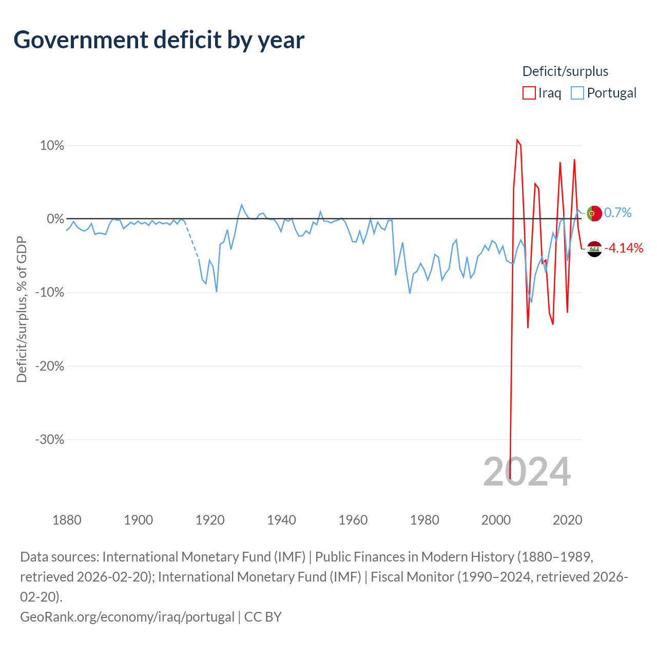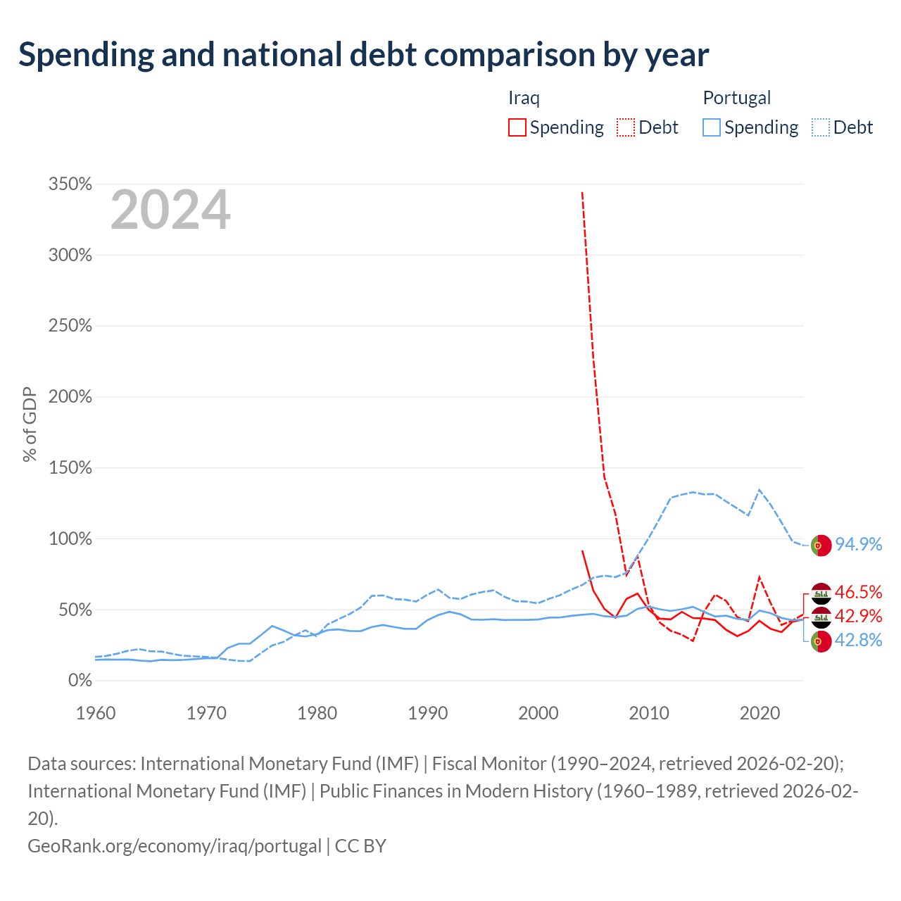 Iraq has $130B in government debt (46.5% of GDP), compared to $297B (94.9% of GDP) in Portugal.