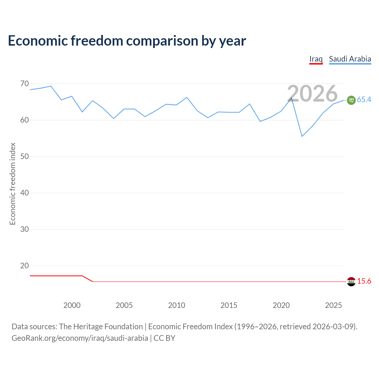 The Economic Freedom Index for Iraq is 15.6, ranking 196/197, compared to 65.4 for Saudi Arabia, ranking 65/197. The chart above displays a comparison of annual changes in economic freedom indexes.