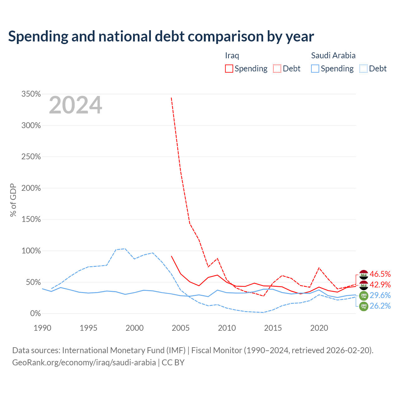 Iraq has $130B in government debt (46.5% of GDP), compared to $324B (26.2% of GDP) in Saudi Arabia.