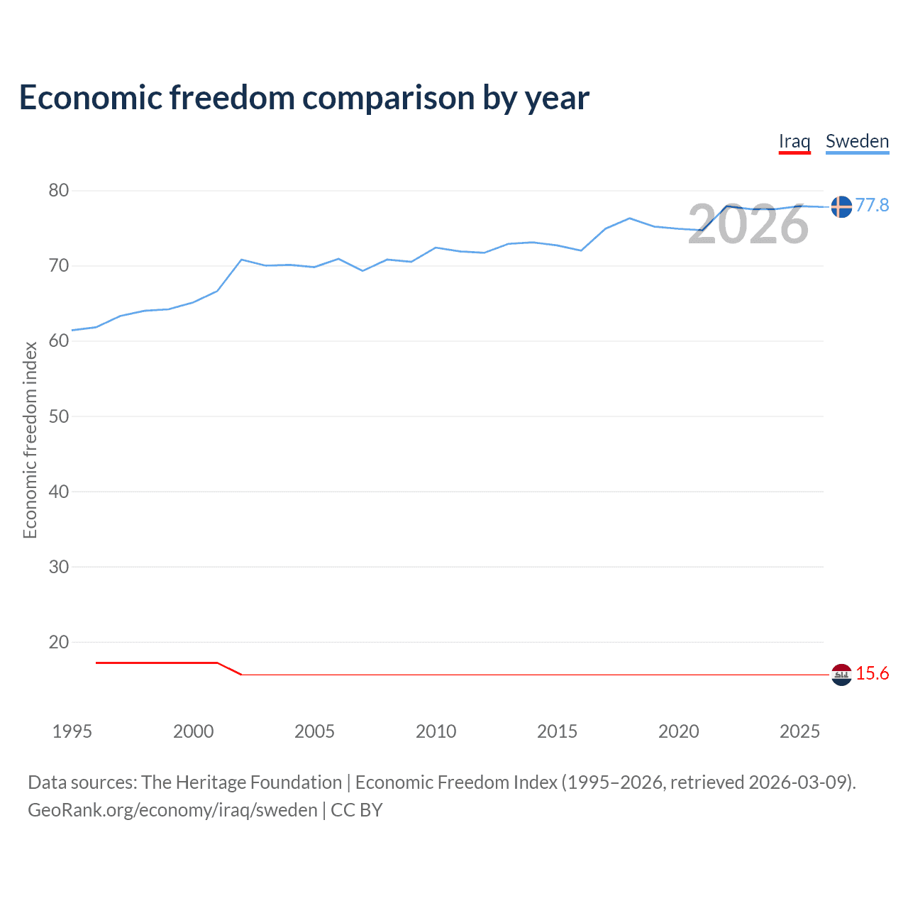 The Economic Freedom Index for Iraq is 15.6, ranking 196/197, compared to 77.8 for Sweden, ranking 14/197. The chart above displays a comparison of annual changes in economic freedom indexes.