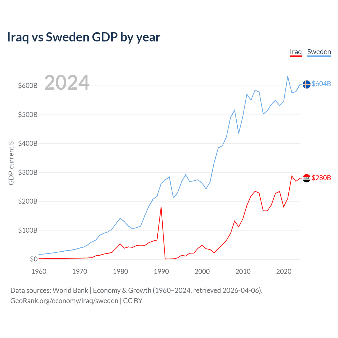 Iraq has a GDP of $280B compared to $604B for Sweden, ranking 50/197 and 26/197 by economy size, respectively.