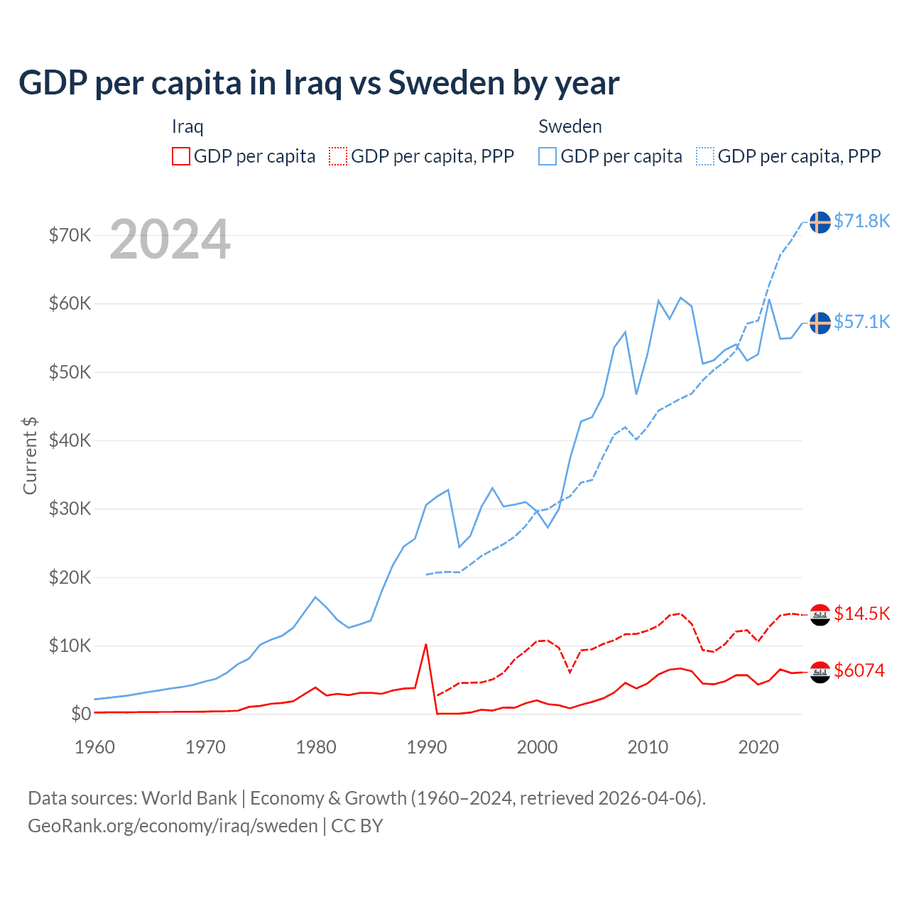GDP per capita in Iraq vs Sweden by year