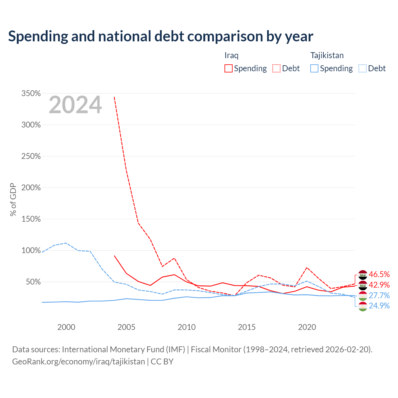 Iraq has $130B in government debt (46.5% of GDP), compared to $3.54B (24.9% of GDP) in Tajikistan.