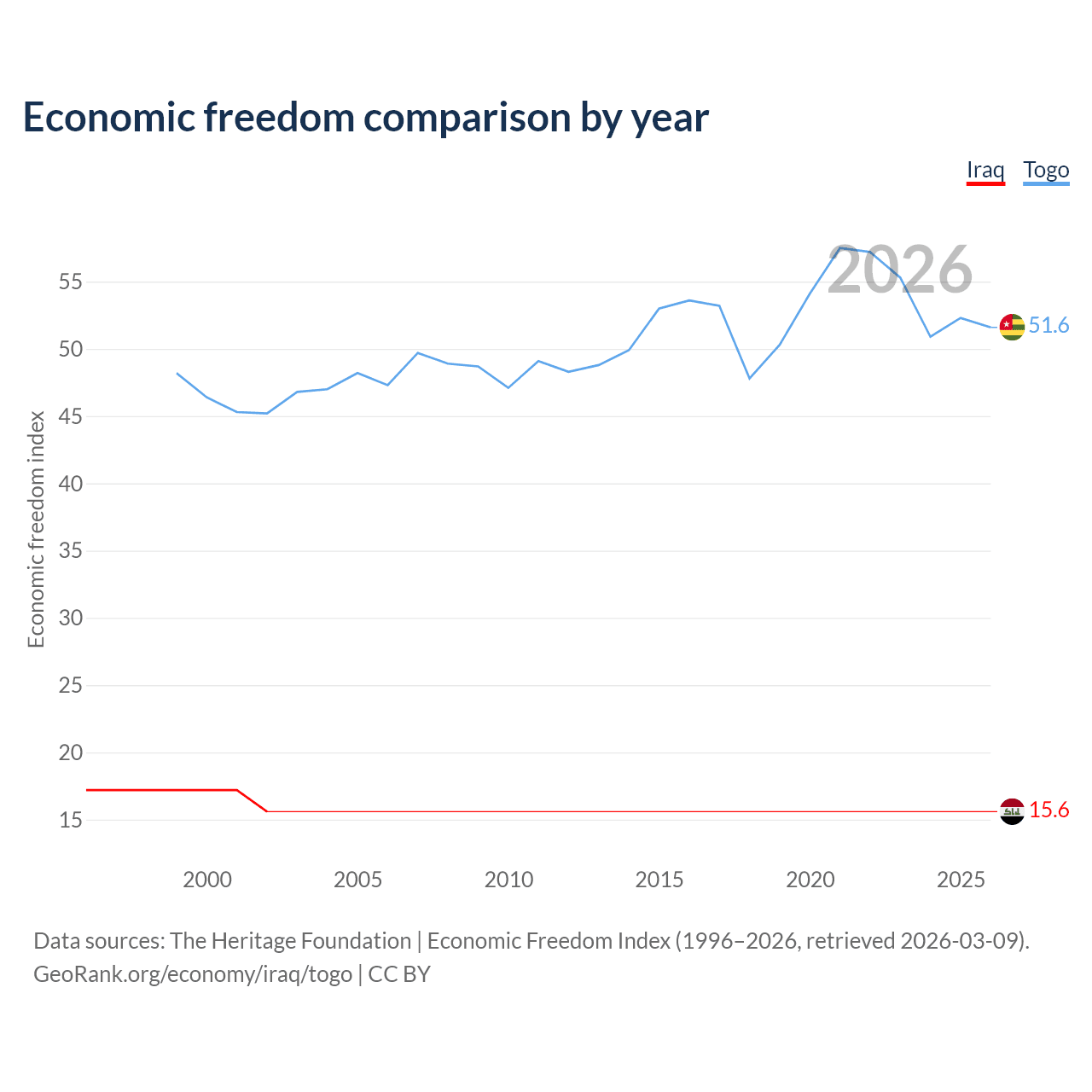 The Economic Freedom Index for Iraq is 15.6, ranking 196/197, compared to 51.6 for Togo, ranking 153/197. The chart above displays a comparison of annual changes in economic freedom indexes.