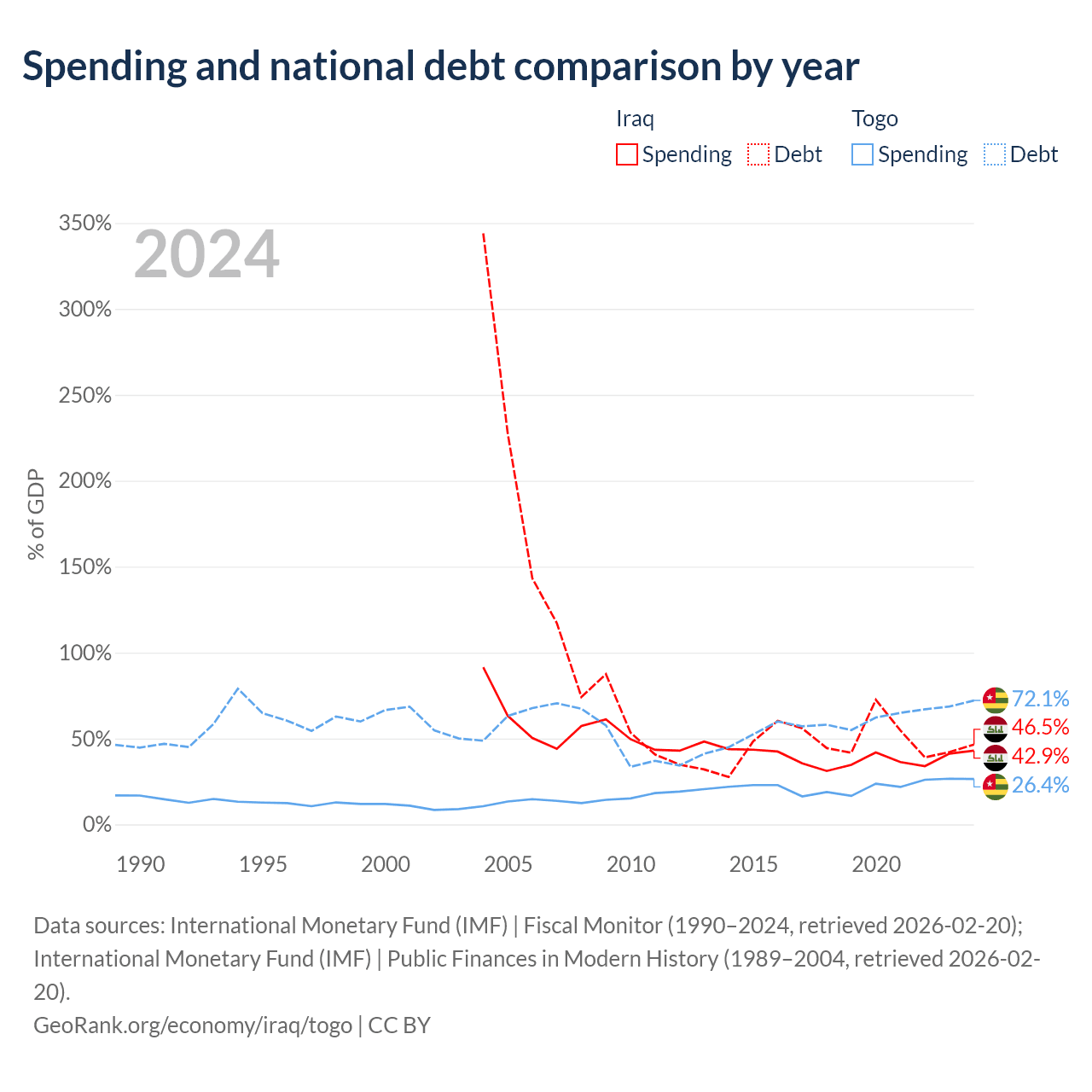 Iraq has $130B in government debt (46.5% of GDP), compared to $7.68B (72.1% of GDP) in Togo.