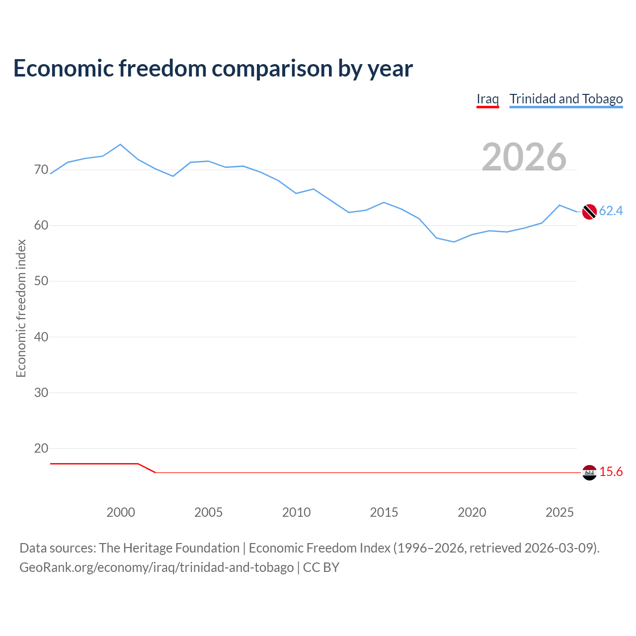 The Economic Freedom Index for Iraq is 15.6, ranking 196/197, compared to 62.4 for Trinidad and Tobago, ranking 87/197. The chart above displays a comparison of annual changes in economic freedom indexes.