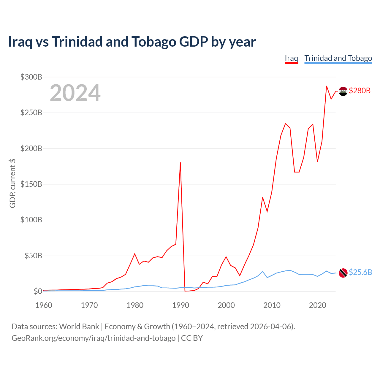 Iraq has a GDP of $280B compared to $25.6B for Trinidad and Tobago, ranking 50/197 and 115/197 by economy size, respectively.