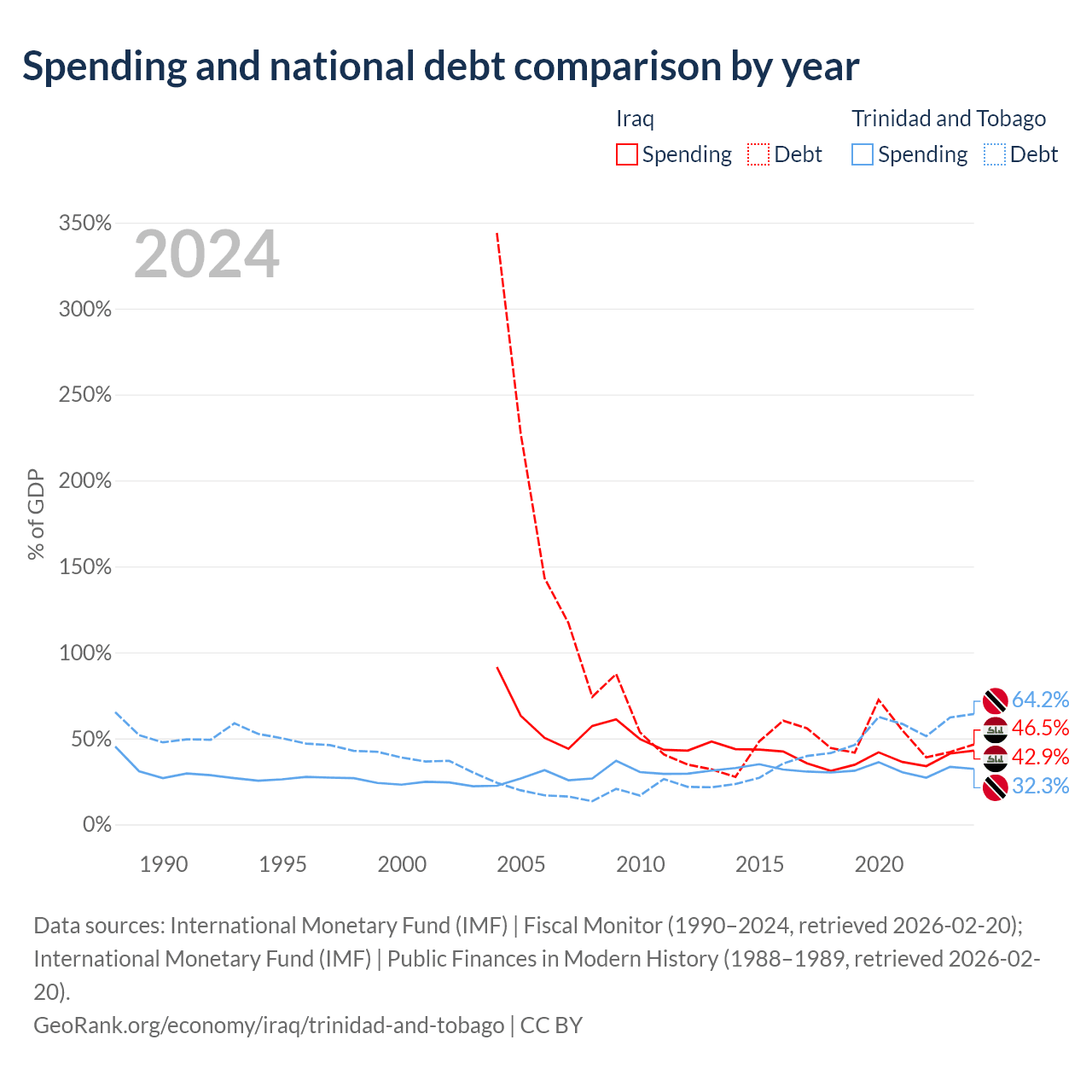 Iraq has $130B in government debt (46.5% of GDP), compared to $16.5B (64.2% of GDP) in Trinidad and Tobago.