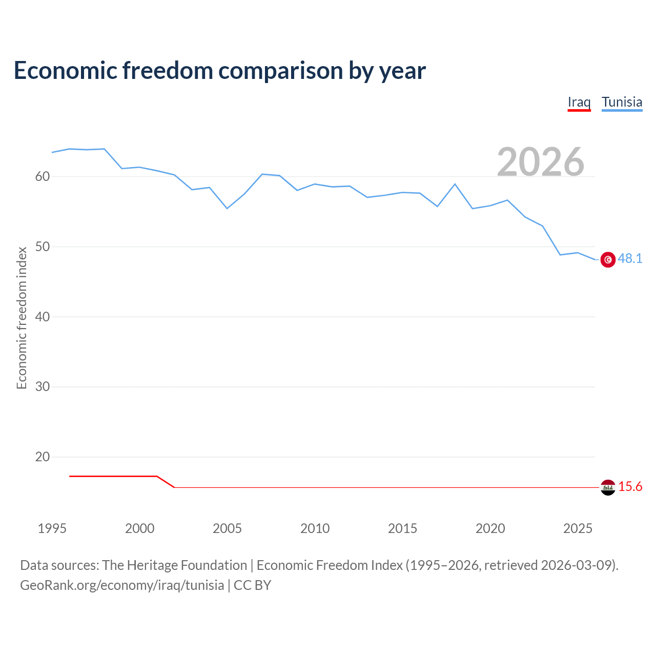 The Economic Freedom Index for Iraq is 15.6, ranking 196/197, compared to 48.1 for Tunisia, ranking 172/197. The chart above displays a comparison of annual changes in economic freedom indexes.