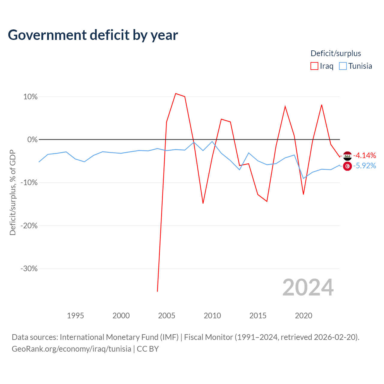 Iraq has $130B in government debt (46.5% of GDP), compared to $42.8B (83.4% of GDP) in Tunisia.